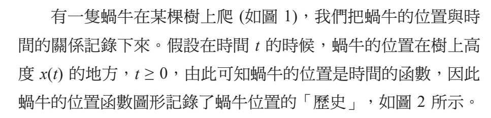 大雄在一條筆直的公路上騎越野車。我們把越野車的位置與時間的關係記錄下來。假設在時間t 的時候,車子的位置在距離出發點y(t)的地方, t>=0,由此可知車子的位置是時間的函數,因此車子的位置函數圖形紀錄了車子位置的「歷史」。 下圖是互動程式,先設定分成2,3,4或5段,然後移動A、B...等點,拉出該分段定義函數的位置函數圖形之後,再按下"start",你就可以看到大雄如何騎越野車。